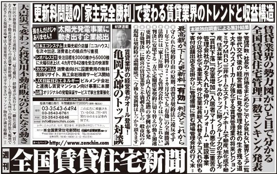 週刊全国賃貸住宅新聞は資産価値から利用価値へという住宅市場の構造変化にいち早く注目。賃貸経営、賃貸管理・仲介、土地の有効活用などの専門紙として1989年に創刊されました。賃貸経営に役立つ情報や、オーナー・不動産会社のニーズ、最新の設備やサービスなど、時代の変化を細かく拾い出し、最新情報を提供していきます。