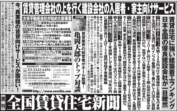 週刊全国賃貸住宅新聞は資産価値から利用価値へという住宅市場の構造変化にいち早く注目。賃貸経営、賃貸管理・仲介、土地の有効活用などの専門紙として1989年に創刊されました。賃貸経営に役立つ情報や、オーナー・不動産会社のニーズ、最新の設備やサービスなど、時代の変化を細かく拾い出し、最新情報を提供していきます。
