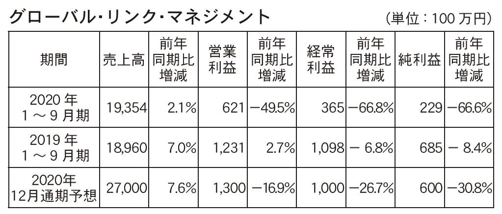 グローバル・リンク・マネジメント(東京都渋谷区)が9日に発表した2020年1~9月連結決算は増収減益となった。不動産ソリューション事業の1棟販売計画が順調に進捗したことや、プロパティマネジメント事業の安定拡大から増収を確保した。一方で、新型コロナウイルスの影響により区分・海外販売が減少。第3四半期の一時的な1棟販売の収益性低下も影響した。費用面では前会計年度の不動産取得に関わる租税公課の増加、オフィス拡張による地代家賃の増加、事業規模拡大に向けた借入金の増加による支払利息の増加があった。