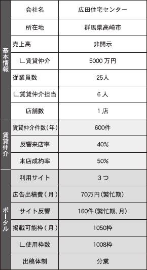 売買仲介事業が主力の広田住宅センター(群馬県高崎市)は、グループ全体の総売上高(非開示)のうち賃貸仲介事業の構成比率は1割に満たず、売り上げは5000万円だ。年間の賃貸仲介件数は600件、賃貸管理戸数は1505戸という。仲介業務の担当社員は6人いる。全従業員数の約5分の1を割いている。