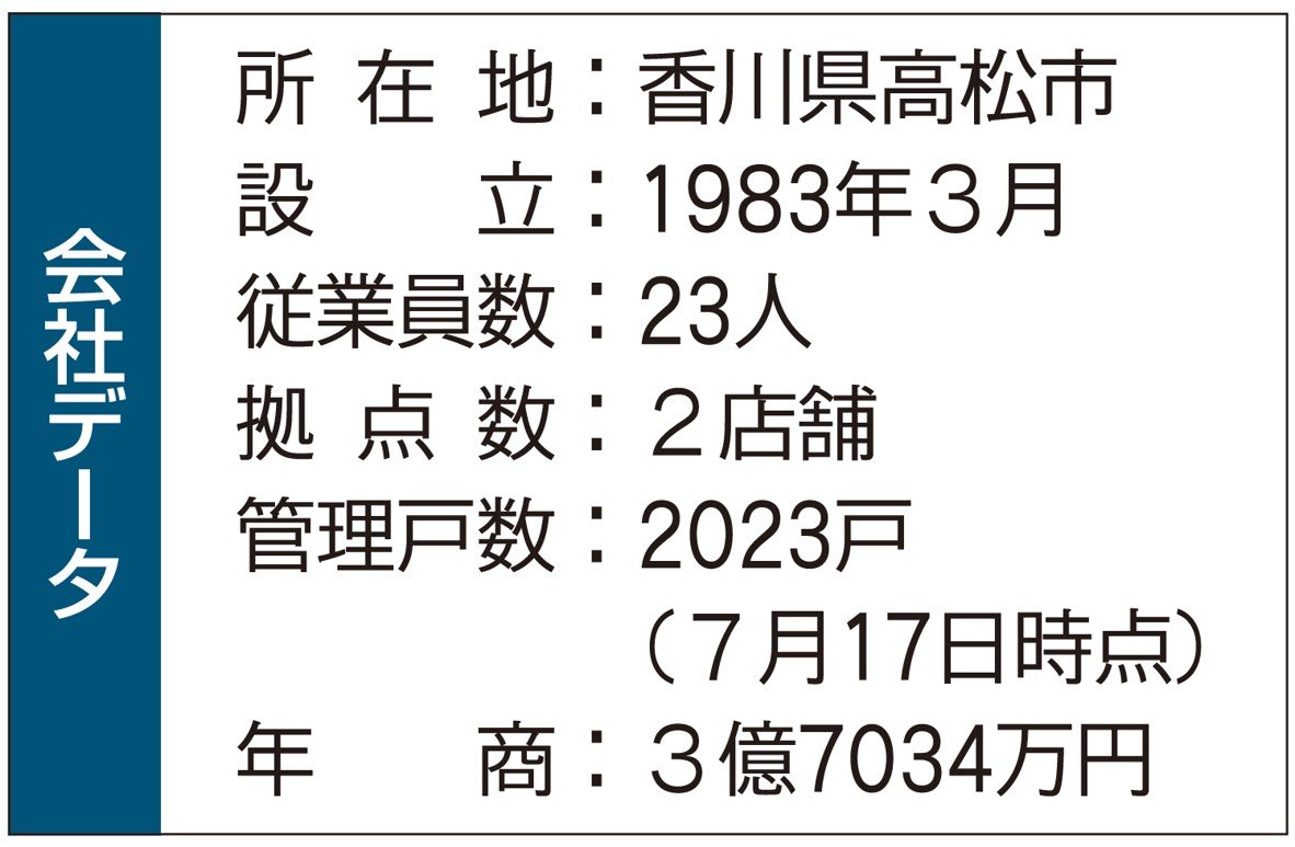 商圏は香川県高松市南部。22年度の売り上げは3億7034万円。そのうち約7割が賃貸管理によるものだ。賃貸仲介は約2割、残り約1割が売買仲介。管理戸数は7月17日時点で2023戸、賃貸仲介は年間約540件を手がける。