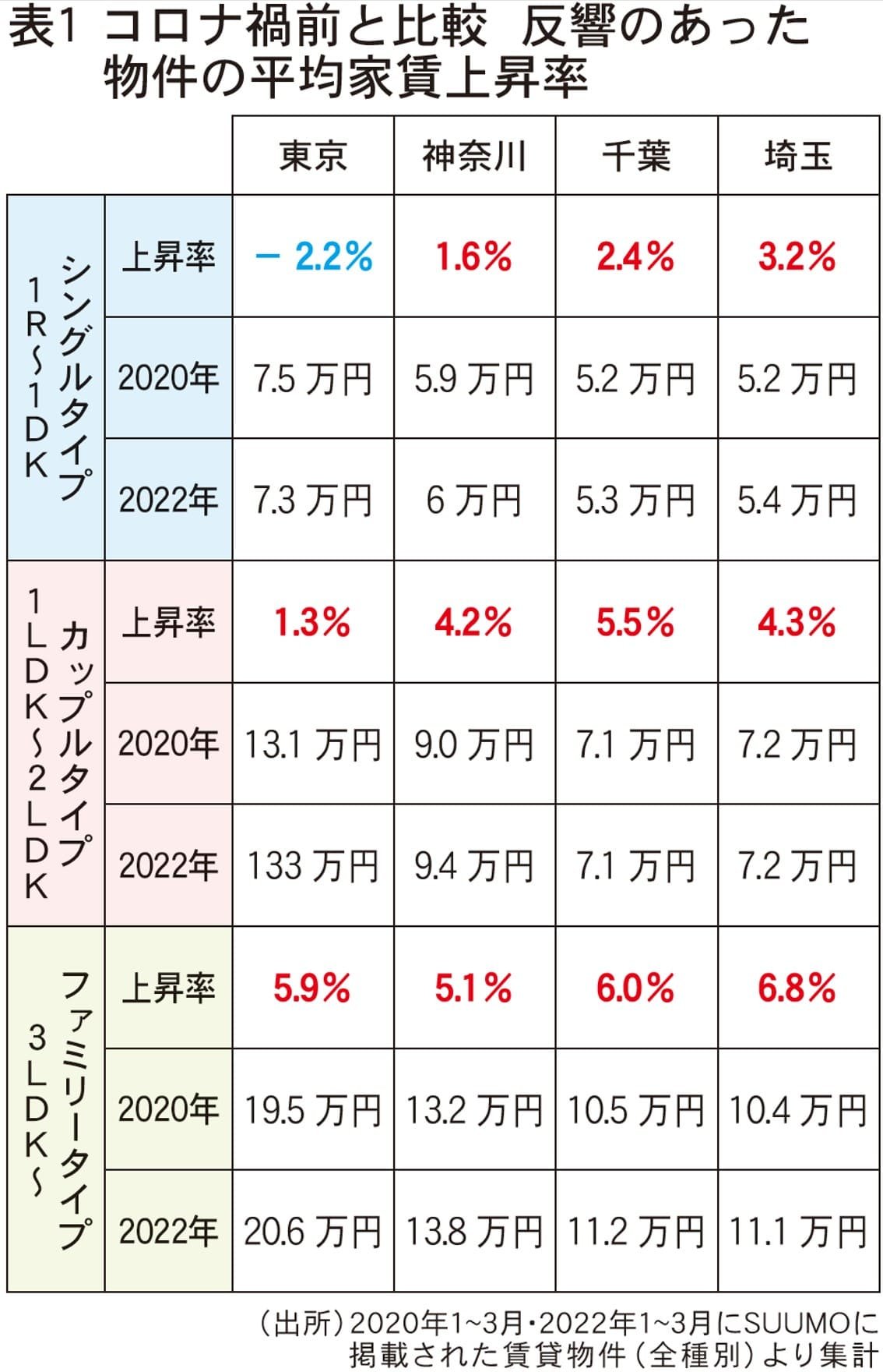 上昇額はシングルタイプで1000円~2000円程度、カップルタイプで2000円~4000円程度、ファミリータイプで6000~1万1000円程度で、広い間取りほど上昇率も高かった。(表1)