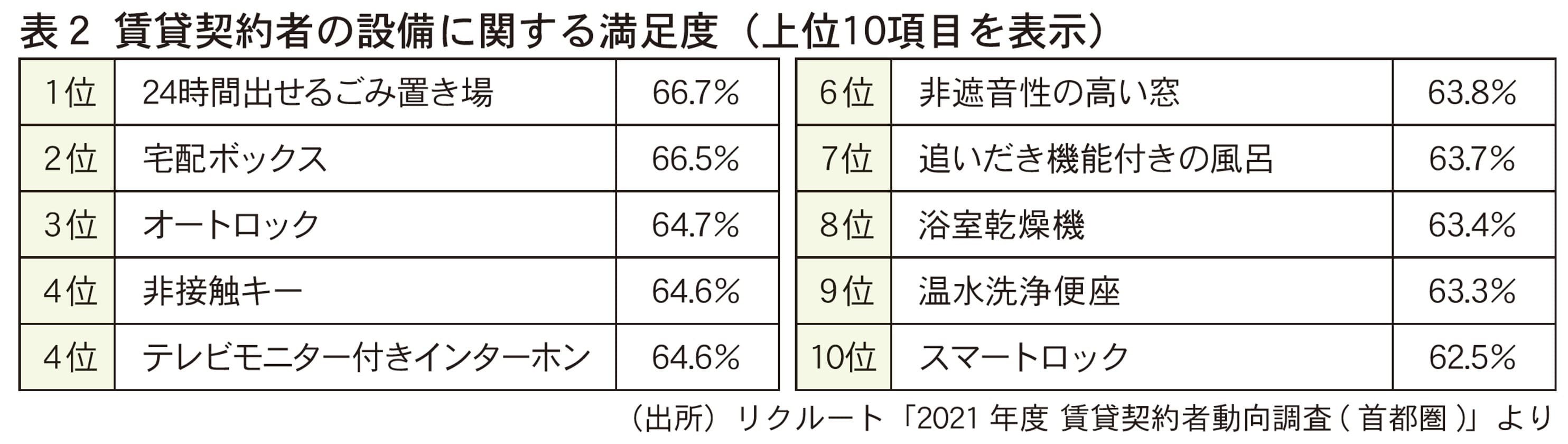 一つは、コロナ禍でニーズが加速した設備・サービスの設置や住宅性能の向上である。当社が実施した「2021年度 賃貸契約者動向調査(首都圏)」の設備に対する満足度では、「24時間出せるゴミ置き場」が6年連続1位で、2位の「宅配ボックス」と6位の「遮音性の高い窓」などは前回より順位を5ランク以上アップさせた。