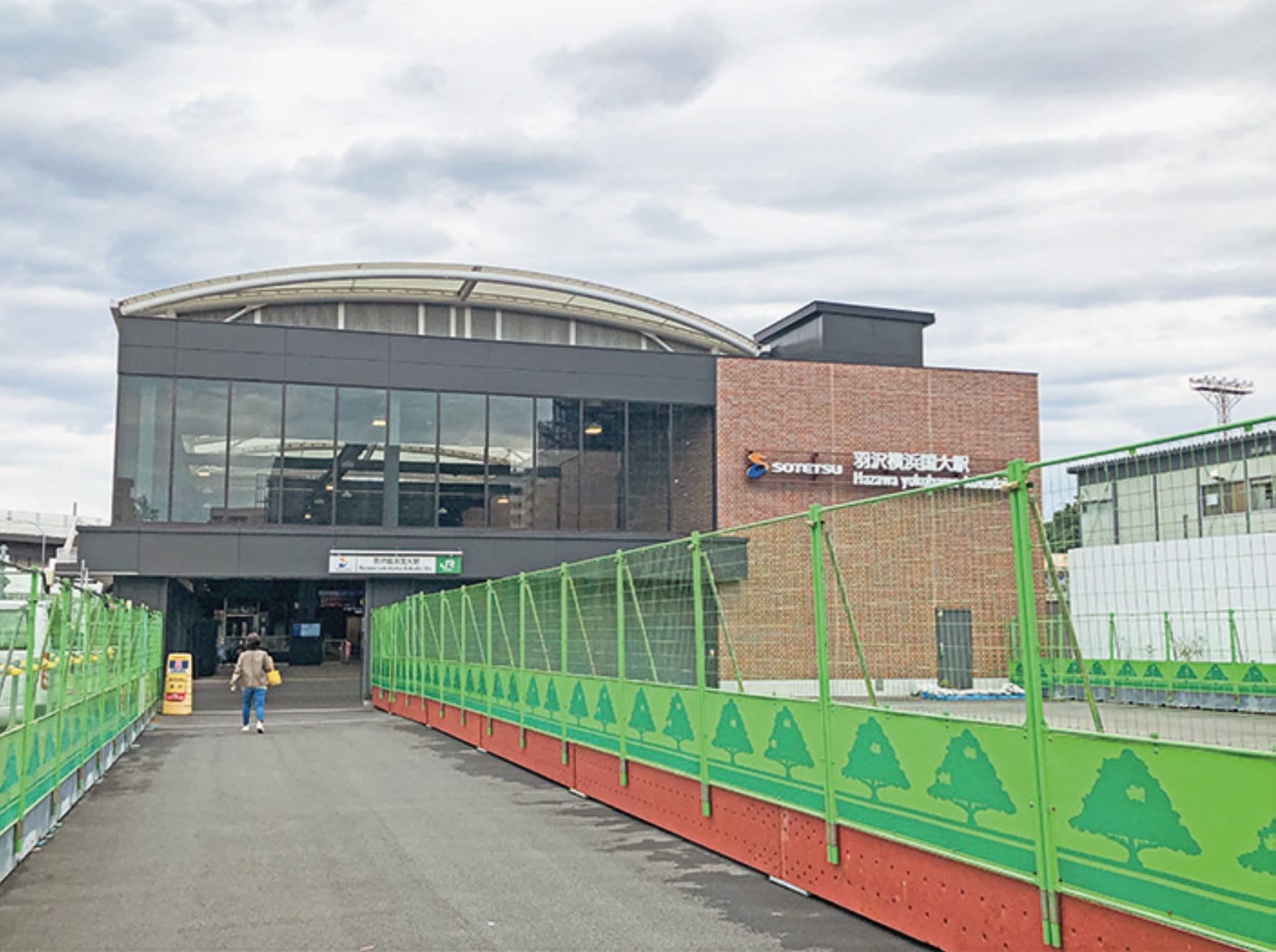羽沢横浜国大駅駅舎。駅前には商業施設・病院が一体となった高層マンションの建築が進む