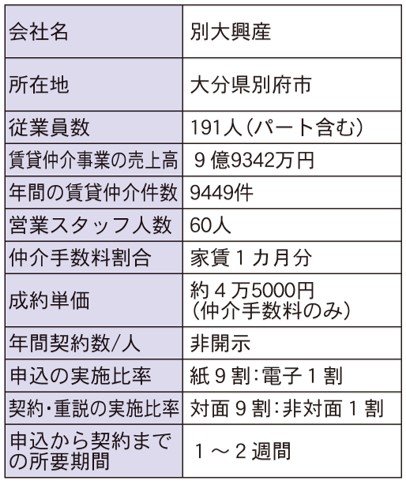 【賃貸仲介会社の経営分析】大分別大興産重説は対面が9割 別大興産,マネージメント保証,ジェイリース 管理・仲介業|2022年03月17日 5月に全面解禁となる電子契約に向け、賃貸仲介業務のDX(デジタルトランスフォーメーション)への動きが見られる。一方、契約書のやり取りを行う管理会社などとのシステム連携に苦戦し、賃貸仲介のデジタル化がストップしてしまうケースもある。問い合わせから契約までの業務における、現場のリアルな電子化の状況と、その理由を不動産会社3社に聞いた。 顧客ニーズを優先 年間9449件の賃貸仲介を行う別大興産(大分県別府市)は、顧客のニーズに応じて、業務のオンライン化を進めていく方針をとる。