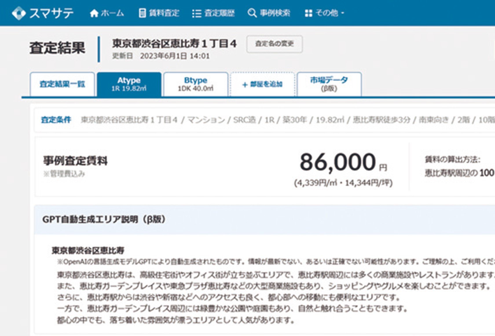不動産会社向けに人工知能(AI)による賃料査定サービス「スマサテ」を提供するスマサテ(東京都品川区)は19日から、スマサテの賃料査定結果画面において、Open(オープン)AI(米国カリフォルニア州)の対話型AI「Chat(チャット)GPT」の活用を本格的に開始した。査定結果の内容に、新たな項目として「GPT自動生成エリア説明(β版)」を追加した。