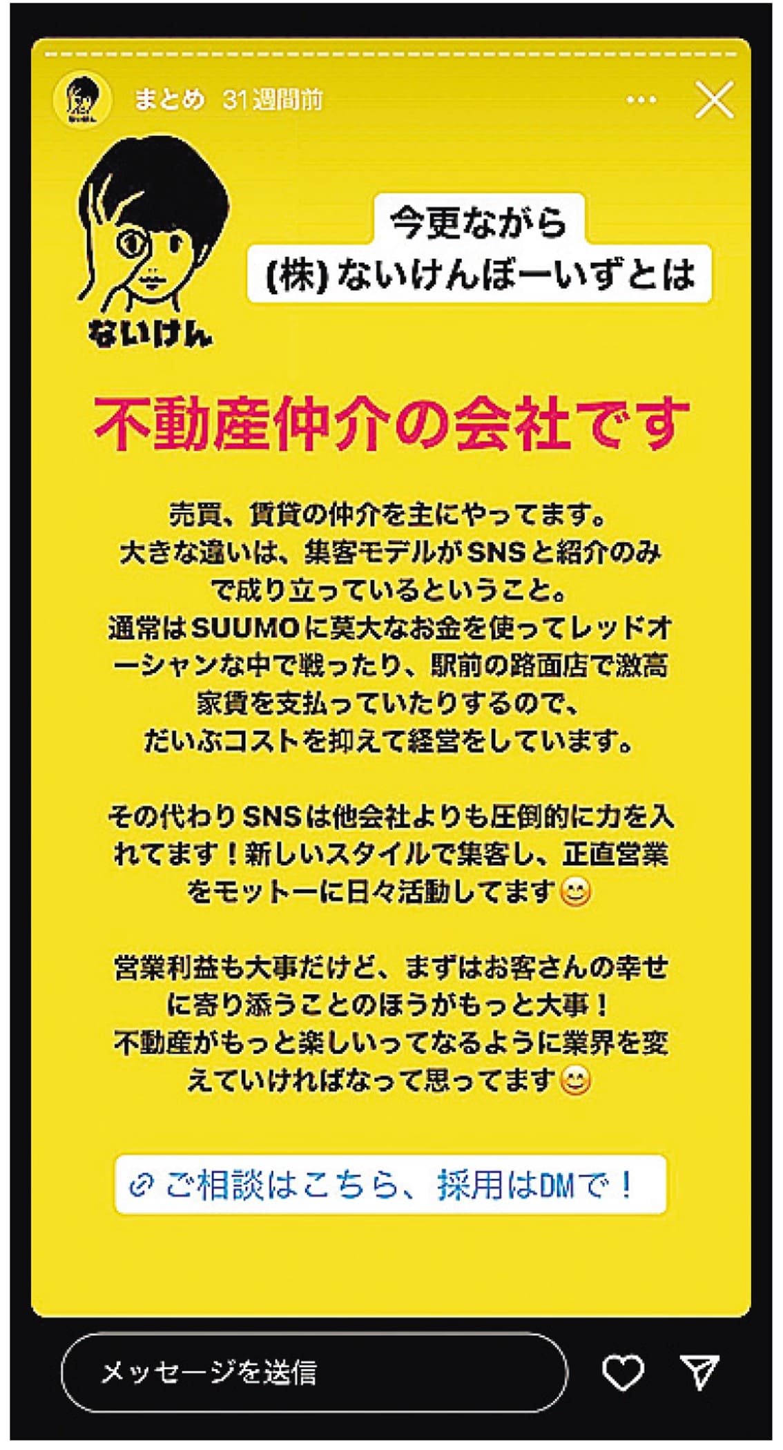 東京都、埼玉県、千葉県、神奈川県の1都3県を商圏に不動産の売買・賃貸仲介を行う、ないけんぼーいず(東京都渋谷区)はSNSを活用し、ブランディングに注力する。知名度を向上させることにより、顧客を獲得している。売買仲介、賃貸仲介件数は非公開。