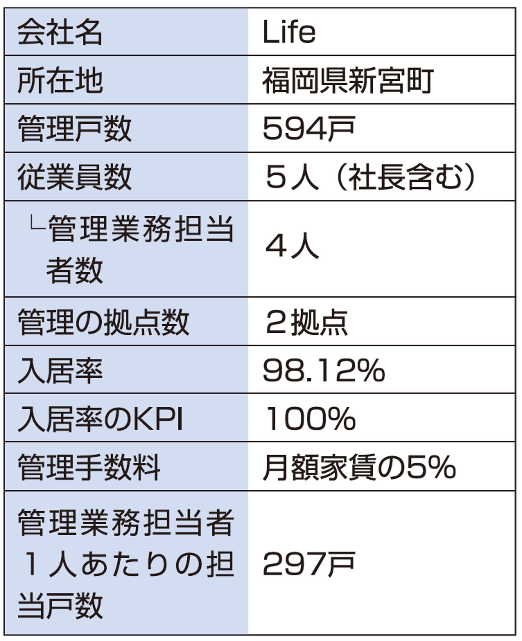 福岡県の飯塚市など県央のエリアを商圏に594戸を管理するLife(ライフ:福岡県新宮町)の管理物件の入居率は98.12%(3月末時点)だ。