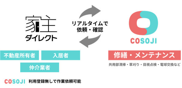 COSOJIとは、不動産オーナーや管理会社が管理物件共用部の拭き掃き掃除や草刈り、電球交換など必要な作業のみを地域住民に依頼することができるマッチングサービス。最近では空き家や空き地、駐車場など、住宅以外の清掃や点検のサービスも行っている。