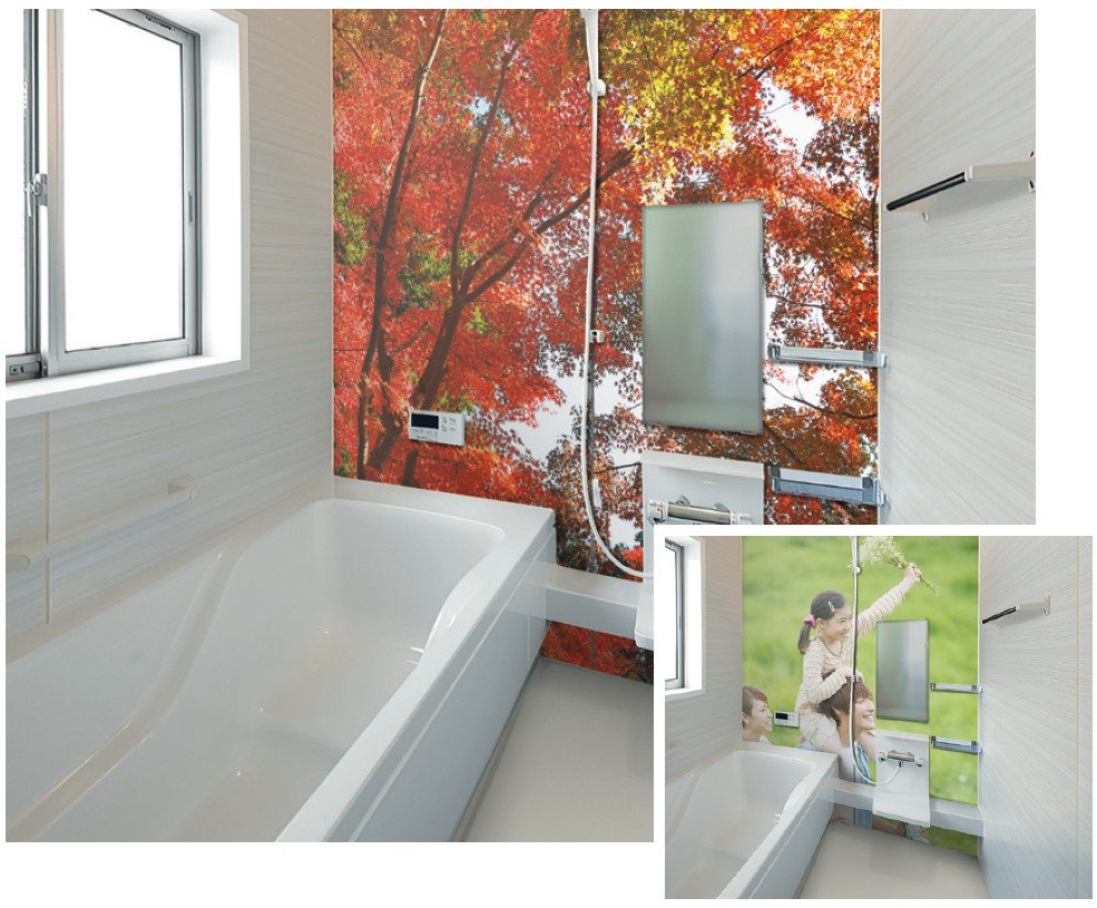 パネルの柄は、ペットの写真や子どもが描いたオリジナルの絵など、好きな絵柄をプリントできる。富士山のイラストで銭湯気分を楽しむなども可能。一面だけでなく壁面全体や天井にも施工でき、浴室空間にエンターテイメント性を取り入れ、充実したお風呂時間を生み出す。