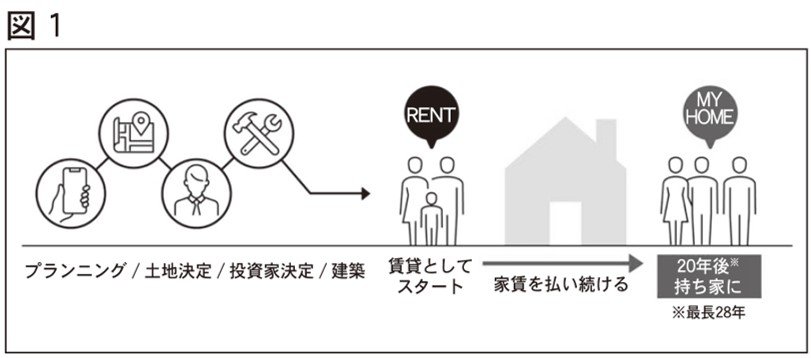 譲渡型賃貸住宅『家賃が実る家®』は入居希望者が新築戸建て住宅に一定期間居住し、家賃を払い続けると大家である投資家から入居者へ、その土地と建物が譲渡される仕組みです。入居申し込みの入り口は「賃貸」で入居希望者と投資家の間で「賃貸借契約」と「譲渡予約契約」を締結することで、賃貸借契約期間満了時に所有権が移転されます。