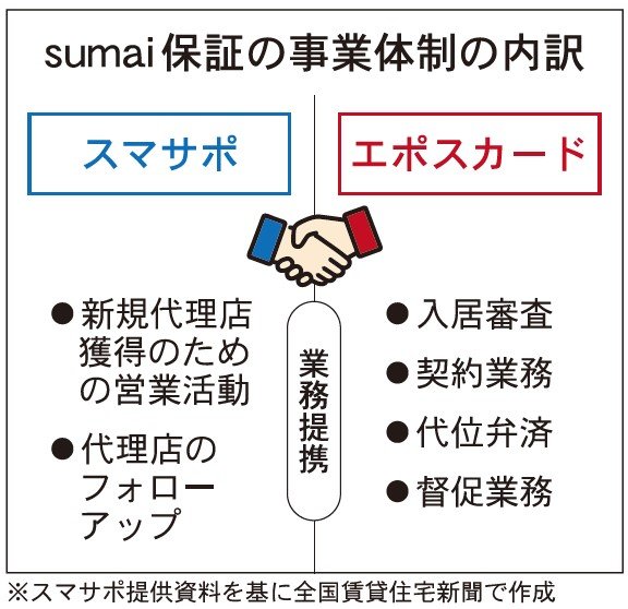 これまでスマサポが展開していた家賃債務保証サービス「sumai(スマイ)保証」の保証業務を、同じく家賃債務保証事業を営むエポスカードが引き受け、スマサポは既存代理店のフォローアップや新規代理店の獲得などの営業活動に注力する。エポスカードが、入居審査や契約業務、代位弁済や督促業務などの保証業務面を支援し、スマサポの業務効率化にもつなげたい考えだ。