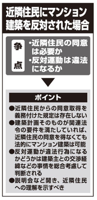 ところが、マンションが建築されると聞きつけた近隣住民が「マンション建築反対」などと書かれた張り紙を張るなど、反対運動が始まってしまいました。私は、マンションを建築するためには近隣住民の同意を得なければならないのでしょうか? また、反対運動を行うことは違法にならないのでしょうか?