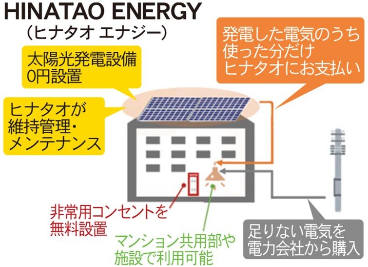 標準条件では、初期費用は無料で通常5日程度の施工で済む。太陽光で発電した電気は共用部で使用し、月々の使用料を徴収する仕組み。使用料のみの支払いとなるため、電気料金のトータルコストは契約前と同等になる。ヒナタオソーラーのみの契約も可能で、不足分の電気は従来の電力会社から調達できる。保守・点検はヒナタオエナジーが行うことから、メンテナンスの負担が発生しない。
