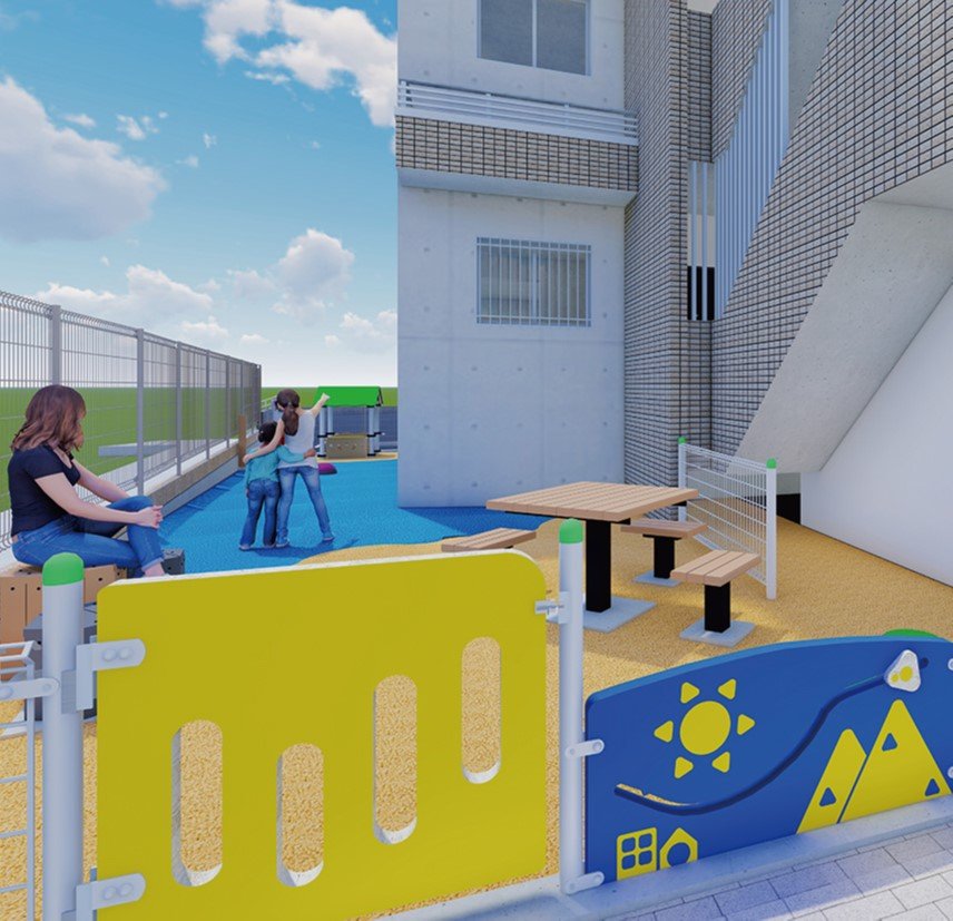 さらに、敷地内にゴムチップで舗装した子ども向けの遊び場を設ける。遊び場には、水遊びができる蛇口やゴムチップスツール、交流可能なテーブルベンチも設置する。