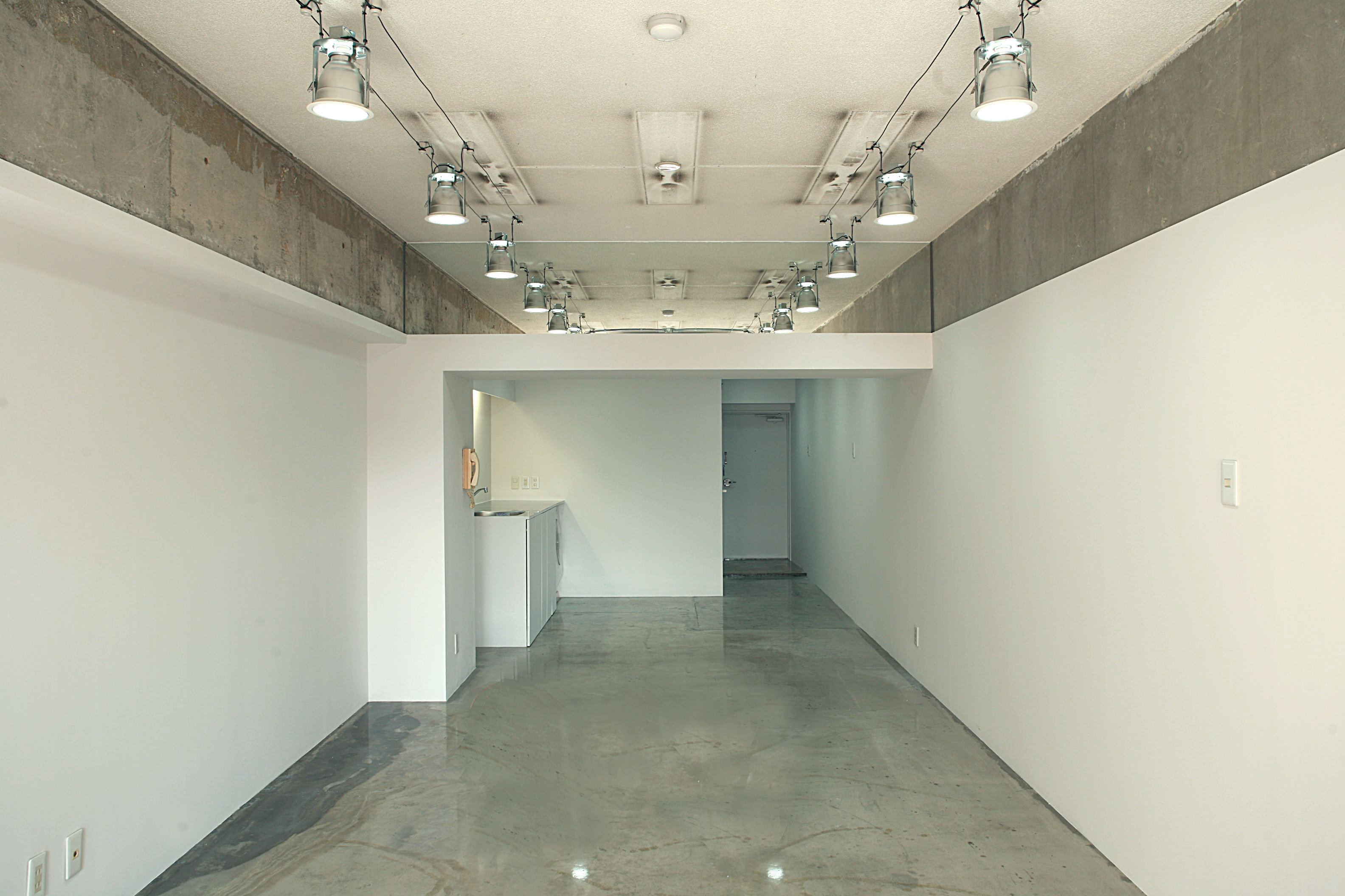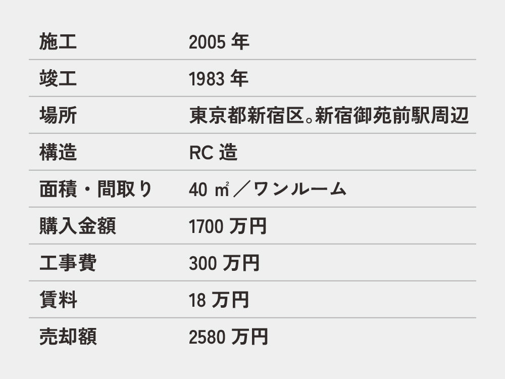 ルーヴィスの1件目の事例 ベランダ側から撮影。梁にガラスを貼り奥行感を演出 玄関側はSOHOでの活用を想定 1件目のリノベは、05年に行った東京都新宿区の区分マンション。債権回収事業を行っていた知人から紹介され、1700万円で購入。背の高い人であればぶつかりそうな高さまである天井の梁が特徴的な物件だった。 場所柄もあり、SOHOでの利用を想定。窓側から見た梁の上部には鏡を設置することで奥行き感を演出。SOHOで使用する玄関側と、居住空間となるベランダ側を緩やかに分割した。 |