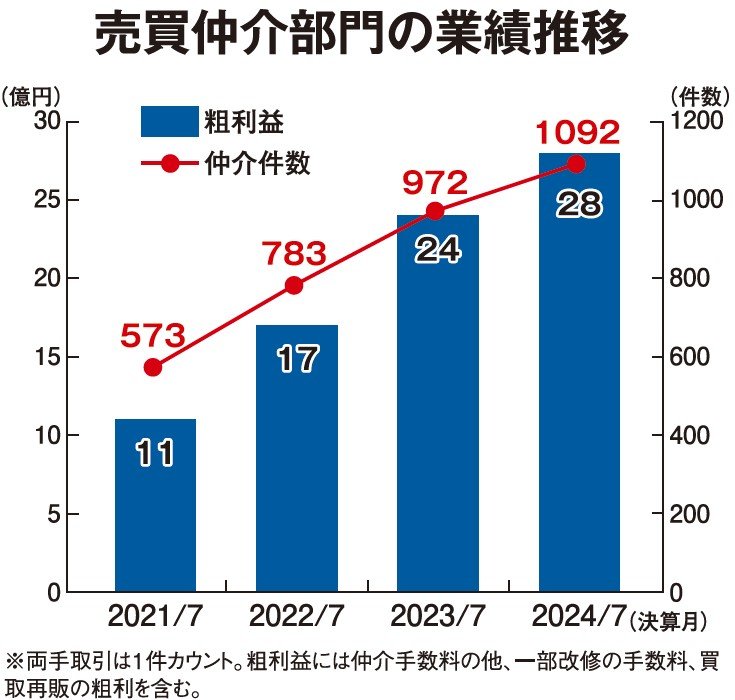 同社は東京都と神奈川県を主な商圏とし、年間取引件数(成約ベース・両手取引は1カウント)は2021年7月期が573件、2022年7月期が782件、2023年7月期が972、2024年7月期が1092と順調に増加している。