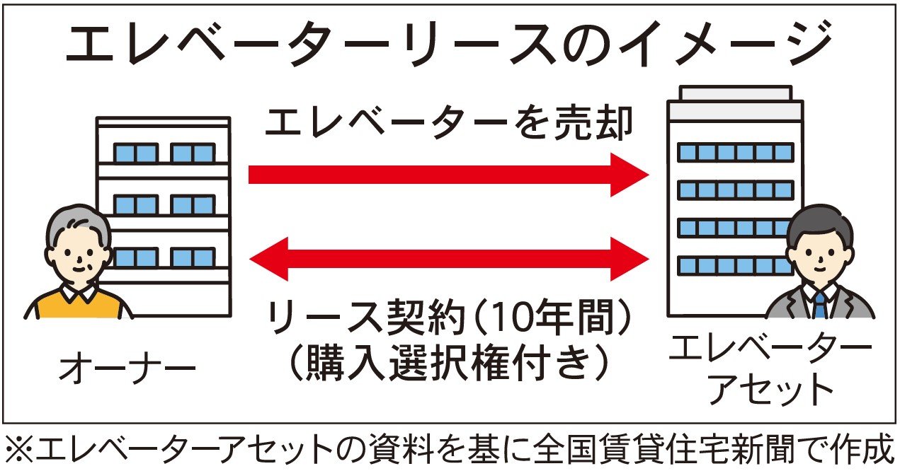 エレベーターリース事業では、築年数が17年を超える物件のエレベーターを同社が購入。そのうえで、エレベーターをリースする契約を同社とオーナーの間で締結。オーナーからリース料を得る。リース期間は10年間。契約期間終了時には、購入選択権行使額を支払うことで、オーナーが同社からエレベーターを買い戻す形だ。