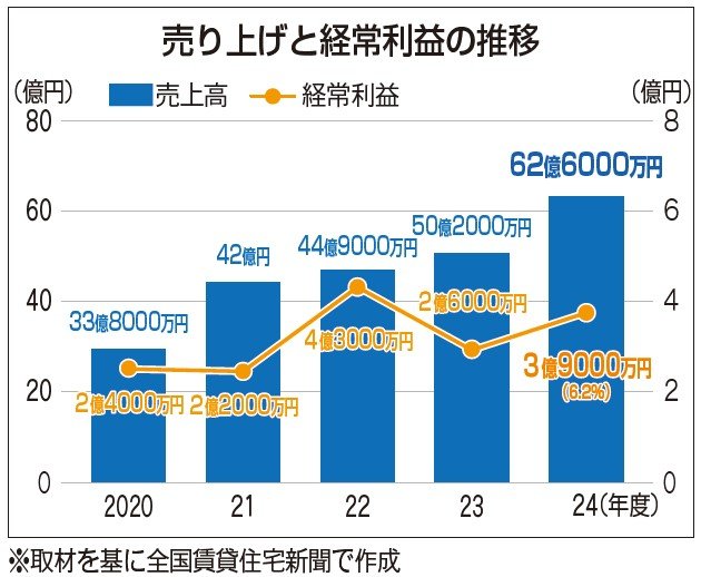 グループの売り上げは前期比24%増の62億6000万円、経常利益は同50%増の3億9000万円となり増収増益で着地した。経常利益率は6.2%で、前期比1.1ポイント増加。メイン事業となるアパート販売が全体の業績をけん引した。