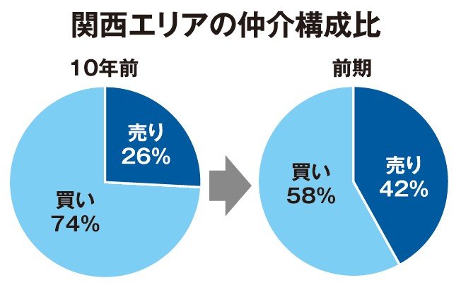 近年は売却案件の獲得に注力してきた。例えば、同社の主要商圏である関西の売買仲介件数は前期ベースで1862件ある。そのうち、買いは58%の1077件。売りは42%の785件。10年前は買いは74%の688件、売りは26%の247件だったため、売りの比率が16ポイント向上している。