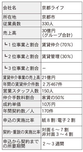 売上高はグループ会社全体で約30億円。事業構成比は賃貸仲介が70%、賃貸管理が30%だ。賃貸仲介事業の売り上げは約21億円。賃貸仲介手数料、広告費、家財保険の代理店手数料が含まれる。仲介手数料は家賃の50%で、広告費は家賃1カ月分だ。賃貸仲介店舗は京都府内に29店舗を出店している。