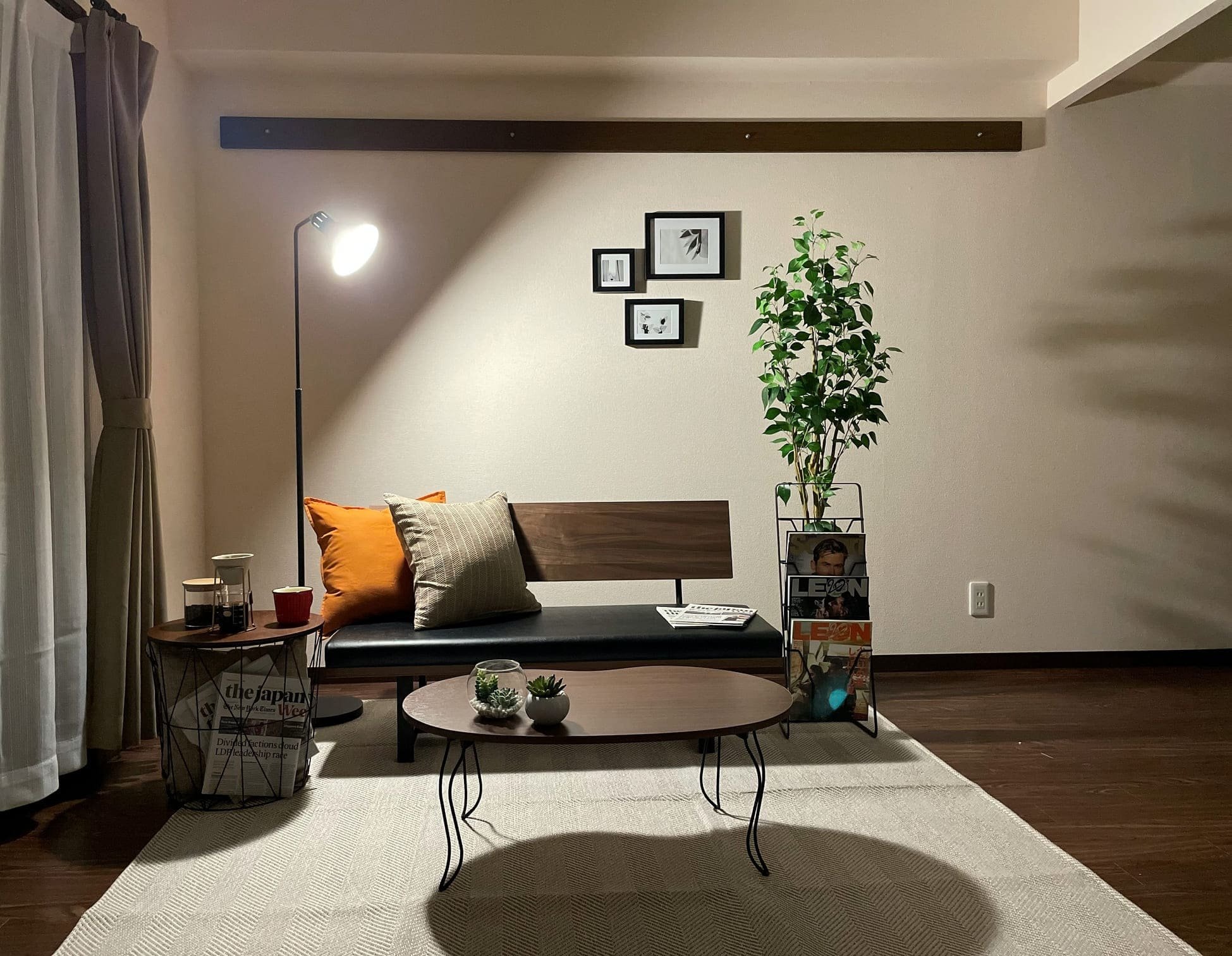 同社の事業戦略室スペシャリストチームの大神田貴氏と大学生のインターン生2人でステージングのプランを練った。ステージングを行った部屋は、周辺相場に比べて家賃の割高な1LDKの物件で、半年近く空室が続いていた。転勤で山梨県に来た30~35歳の社会人男性をターゲットにしたインテリアを起用。男性向け雑誌や英字新聞などを配置し、落ち着いたモダンな部屋を目指した。ステージング後は、家賃を下げることなく約3カ月でターゲットどおりの入居者が決まった。