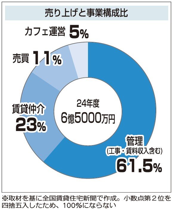 2024年度のグループ売り上げは6億5000万円。事業構成比は、家賃収入と工事を含む賃貸管理事業が61.5%、賃貸仲介は23%、売買は11%、カフェ運営は5%。店舗は古河市に2拠点、創業地の境町に1拠点を置く。従業員数は37人。管理戸数は4300戸(7月1日時点)で、このうち6割を古河市、2割を境町が占める。商圏人口は25万人程度。本社から車で45分圏内を管理エリアとする。