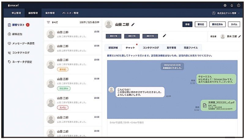 同システムにおいては、LINE上でのやりとりと、顧客情報を一元的に確認でき、管理がばらばらになるという事態を防ぐことが可能だ。またLINEの文面や共有した画像は、リクモ側のサーバー上に長期的に保管され、いつでも確認可能。顧客へのLINE対応では「Chat(チャット)GPT」を用いて返信案を作成できるため、迅速で質の高い対応を実現している。