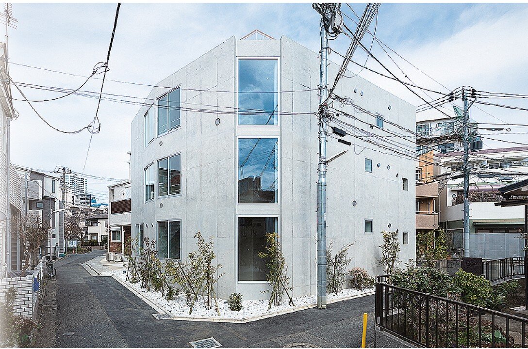 かつて流れていた川の暗渠(あんきょ)に接し、三方が道路に接する不定形な敷地に立つ賃貸住宅がある。建物は4~5の居室が中央の空間を取り囲むように配置された井の字型の形状だ。複雑な路地の一角に印象的な建物を造ることで、周囲の環境を明るくすることにも貢献している。