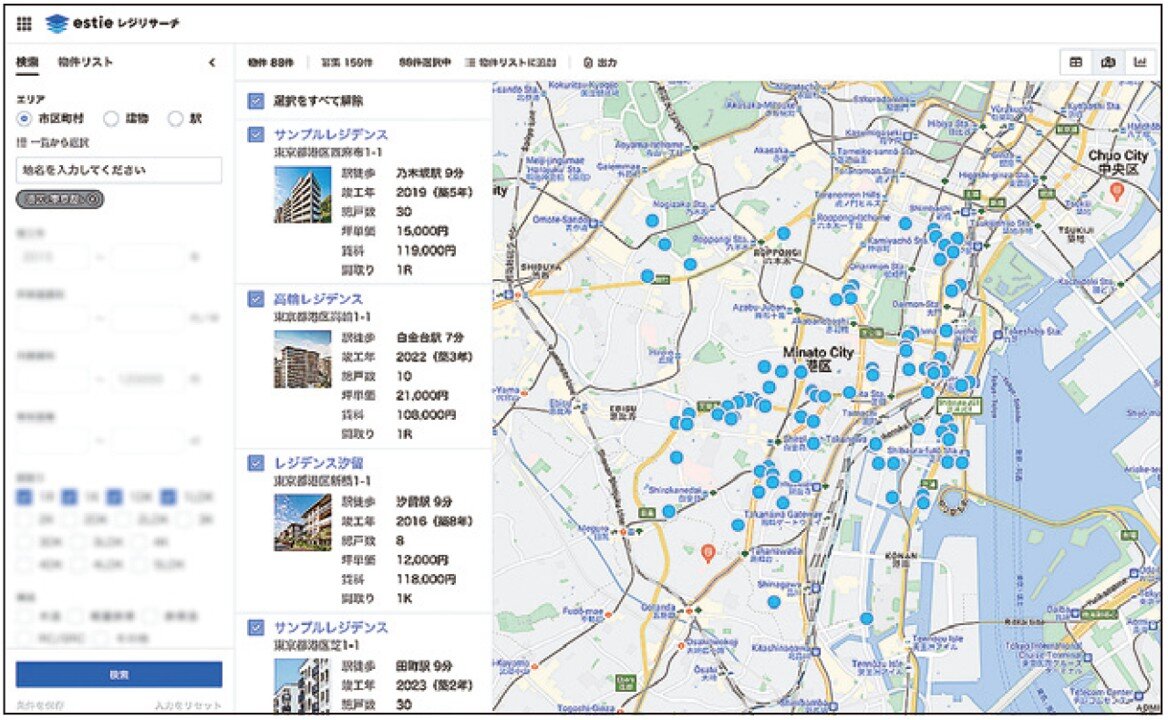 さらに、案件管理や物件売買の支援ツールも備え、情報収集から売買まで不動産取引業務を一気通貫で支える。これらのサービスを活用することで、営業先選定の効率化や新規顧客の開拓、提案内容の高度化、取得・売却のための戦略立案の効率化につなげられるという。ターゲットはデベロッパーや仲介会社といった不動産事業者と収益不動産を扱う金融機関。