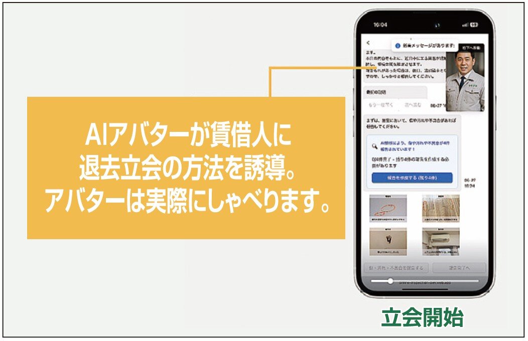 同サービスはオンラインで退去立ち会いを完結させる。賃借人がスマホで室内の動画を撮影。AIが傷や汚損の有無や状況を判定する。傷などが生じた理由については賃借人自身がチャットで報告。その後、退去精算に関する工事内容や賃借人の負担額、負担割合が自動で提示される。