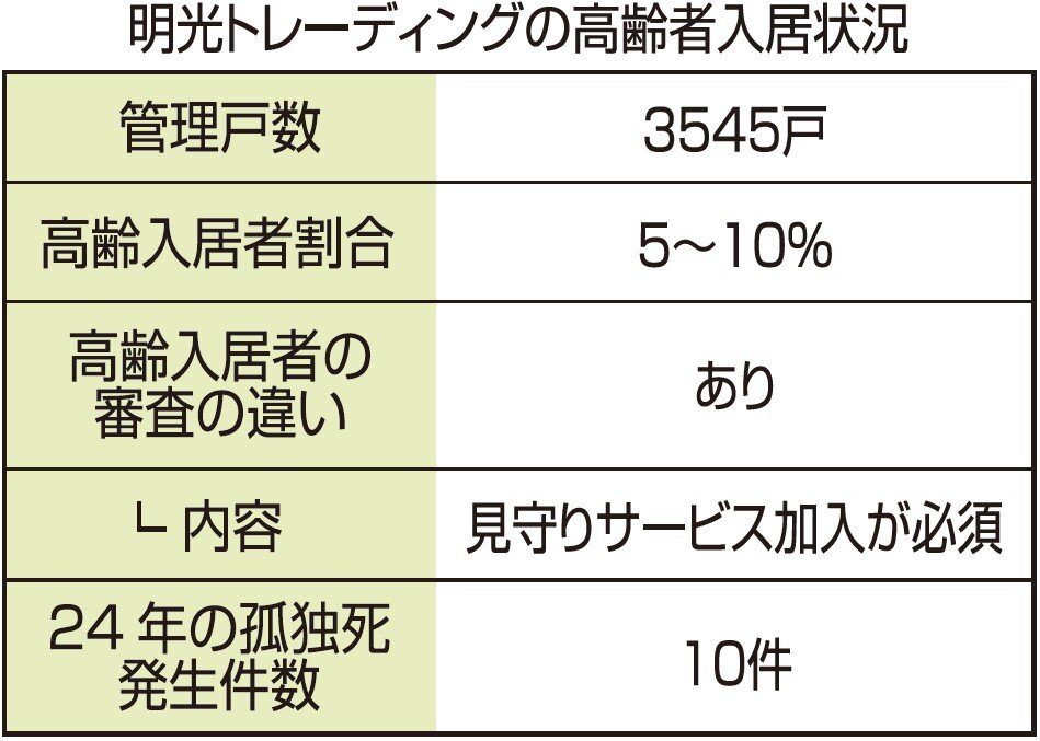 東京都を中心に3545戸を管理する明光トレーディング(東京都渋谷区)では、管理物件での孤独死の増加を受け、2023年から見守りサービス契約を高齢者が入居する際の必須条件とした。今後も増え続ける単身高齢者を入居者として受け入れる体制の構築を進める。