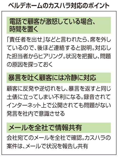 実際に起こったカスタマーハラスメント(以下、カスハラ)への不動産会社の対応や、そこでの学びについて紹介する。ベルデホーム(埼玉県久喜市)は、家財保険の加入について電話口での入居者とのやりとりが激化。一度、時間を空け、双方の対応者が変わったことで、沈静化したという。