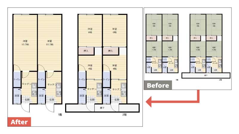 文化住宅は、1975年築で木造スレートぶきの2階建て全4戸。1Kと2Kが2戸ずつあり、全戸が長く空室だったという。建物の老朽化が激しく、そのままでは貸し出すことは難しい状況だった。なおかつ、建築基準法上の道路に2m以上接していないため、再建築は不可能といった問題点も多かった。