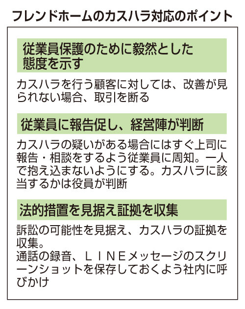 鎌田社長は「カスハラの疑いがある場合には、すぐ上司に報告・相談をするよう従業員に周知している。カスハラに該当するかは役員が判断する。従業員に対しては、一人で抱え込まずに報告してくださいと、朝礼などの場で伝えている」と語る。