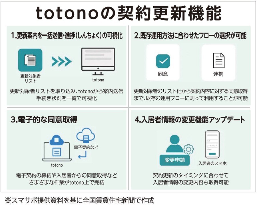 入居者向けアプリ「totono(トトノ)」を提供するスマサポ(東京都中央区)は、同アプリに新機能を実装した。賃貸借契約の更新をアプリ上で行うことができる。