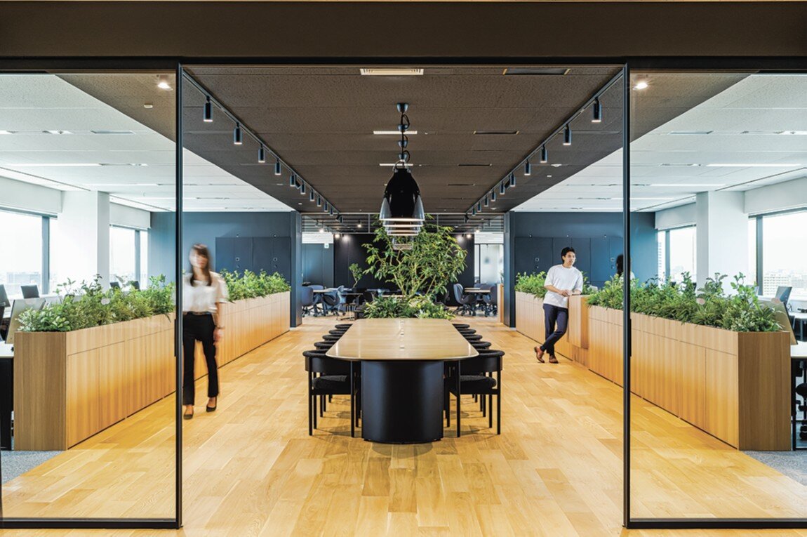 営業とバックオフィス部門の社員が勤務する最上階は、東西方向に236坪あるフロアを同社のみ使用する。バックオフィス部門の社員は、北と南の両サイドの窓側に固定席を設け、営業の社員は中央部の席をフリーアドレス制で使用し、お互いに声をかけやすいようにした。中心部には、ランチミーティングや社内イベントを行える休憩スペースも設けている。
