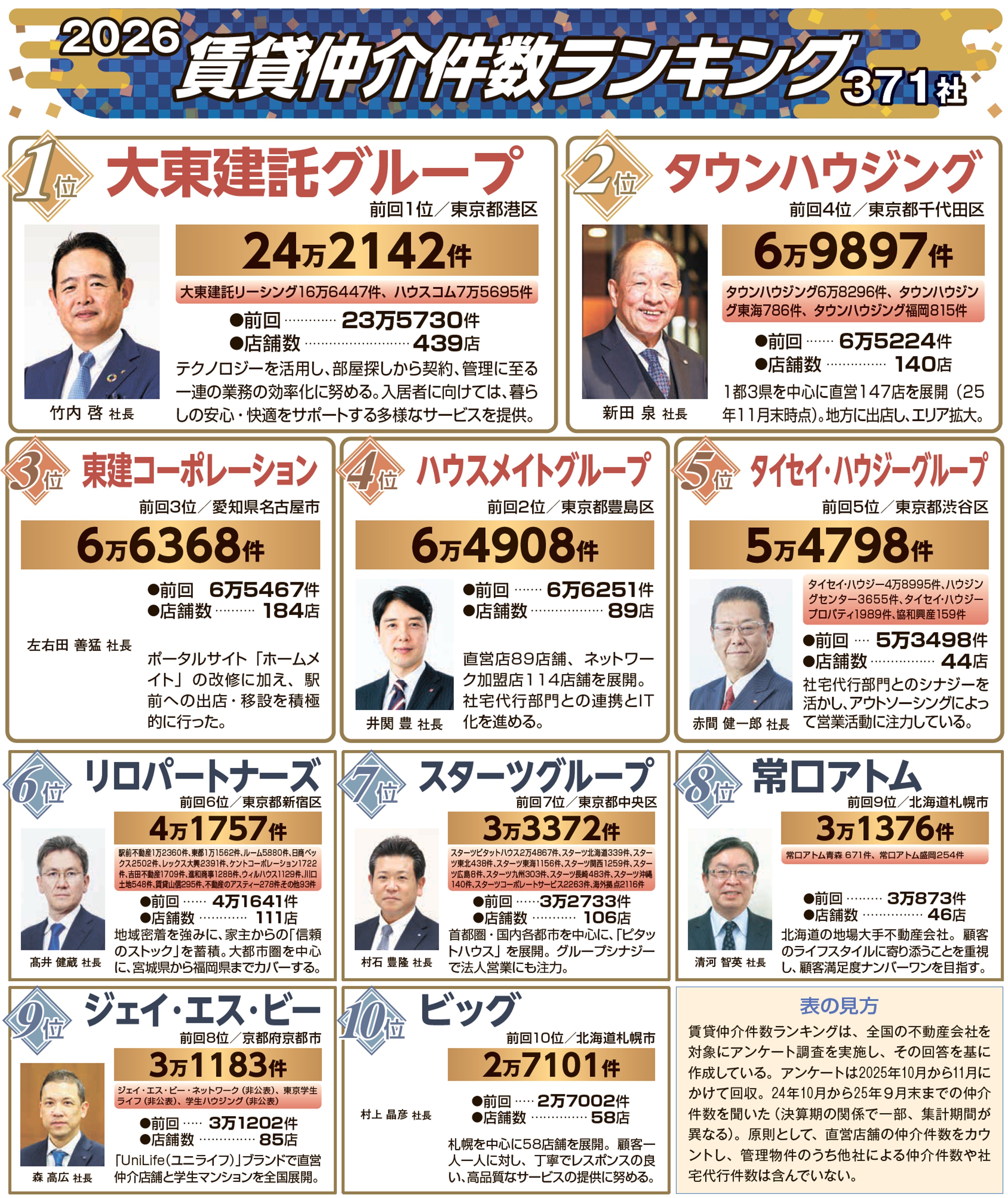 「賃貸仲介件数ランキング2026」には、全国の有力不動産会社371社が参加した。大東建託グループは安定の首位。前回の4位から2位へと飛躍したのがタウンハウジングだ。地方大都市に商圏を広げる。常口アトムは順位を一つ上げて8位につけた。
