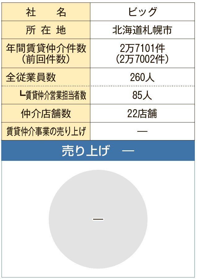 年間賃貸仲介件数2万7101件のビッグ(北海道札幌市)は、トップ10を堅持。前回比で99件の増加となった。賃貸住宅事業を「拡大する」方針で、成約件数の増加および成約単価の向上に意欲を示す。営業本部の加藤大貴課長は「メイン商圏の札幌市の人口は微減傾向ではあるものの、法人や学生など地方から流入してくる層は毎年一定数いる。人材の定着によりスキルの偏りを防ぐことができれば、これまで取り切れていなかった成約を獲得していける」と話す。