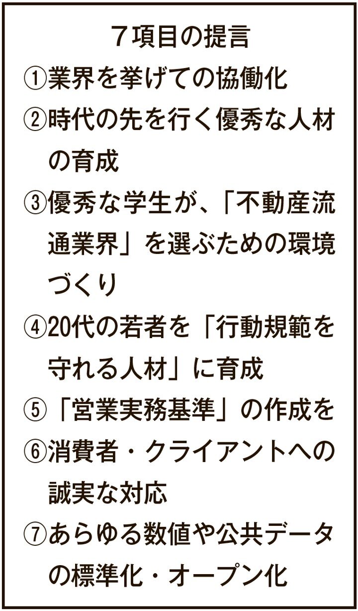 提言は全7項目で、業務プロセスの標準化やDX(デジタルトランスフォーメーション)化、人材育成についてなど多岐にわたる。これらの課題を解決するために、次の2点を重要視する。一つ目は公益社団法人全国宅地建物取引業協会連合会、公益社団法人全日本不動産協会をはじめとする、業界団体の協働体制を目指すこと。二つ目は、 賃貸仲介業務、売買仲介業務と自ら売主となる販売業務について、デジタル化への対応など、宅地建物取引業法自体が現状に合っていない部分について、消費者本位の規定として組み替える必要があるという点だ。