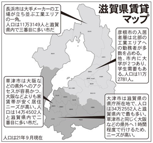 長浜市は滋賀県の最北端に位置し、大手メーカーの工場が立ち並ぶ工業地帯の一角だ。賃貸物件への入居者も、工場への勤務者が多い。21年9月現在の人口は11万3149人。20年12月時点での人口より788人減少している。