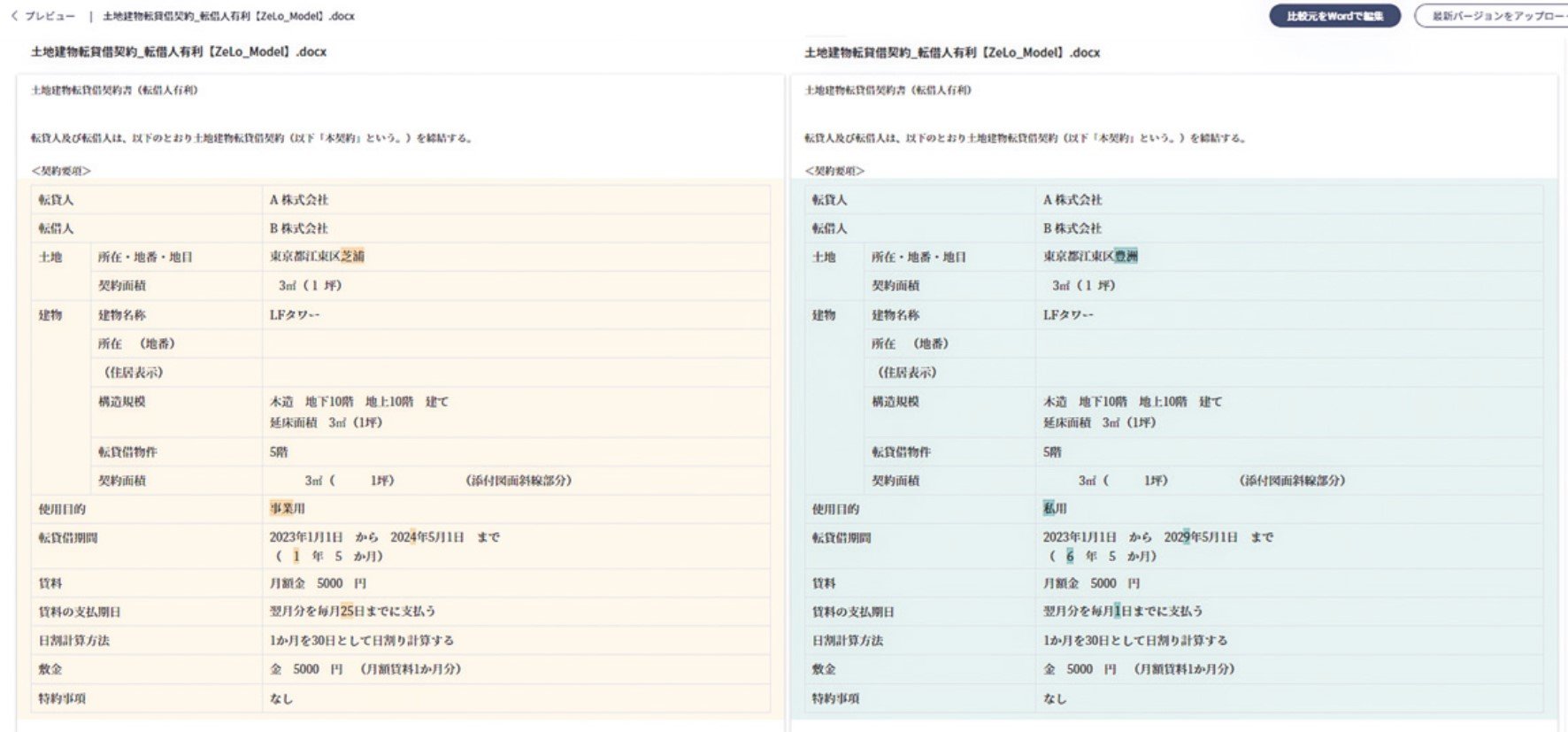 システム開発専任の弁護士がシステムを監修しており、最新の法律にも対応している点が強みとなる。審査に対応する契約書は55類型以上あり、類型や業界ごとにまとめられた契約書のひな型は700以上用意されている。審査の際には、AIが条文の法的適合性や抜け漏れのチェックを行い、修正内容とその理由を表示する。修正前と後の契約書を比較し、差分を表示する機能も搭載。23年1月には、契約書に記載する表の中身の文言の修正箇所も表示できるようになった。