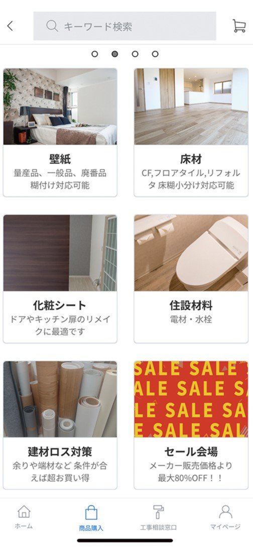 壁紙や床材などの内装材をアプリ内で販売する。取り扱う商品のうち約7割・約1600種類が壁紙だ。提携する内装材メーカー・サンゲツ(愛知県名古屋市)の現行品や、新商品が出たことで販売終了となったメーカー廃番品、アーバントラストのリフォーム現場で出た余剰資材を割安で販売する。DIY初心者が利用しやすいように、施工場所の写真を送ることにより購入品や購入する量、施工の仕方を相談できる「工事相談窓口」も用意している。