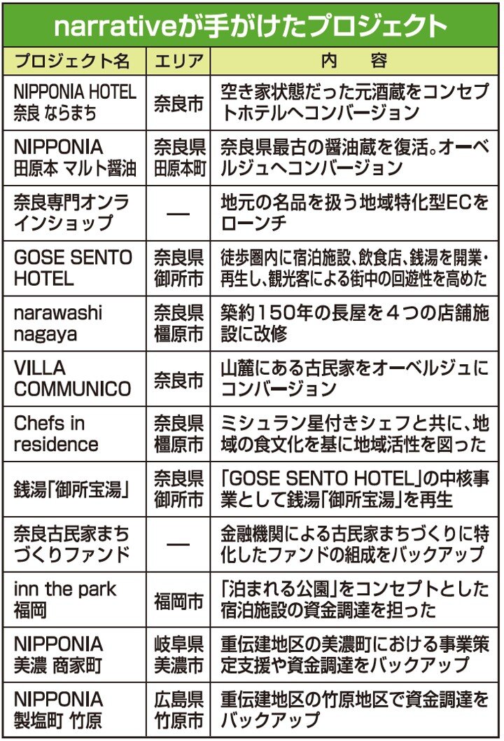 narrative(ナラティブ:奈良市)は、古民家や歴史的建造物など、古い建物を宿泊施設や賃貸住宅に再生する。これまでの再生実績は累計で12件。特徴は、対象とする建物や周辺地域の歴史に基づいた物件企画を行う点だ。再生後の不動産にストーリーを持たせ、ブランディングを図ることで集客性を高める。再生後は地域住民をスタッフとして雇用。地元の主役を立てることで、継続的な事業を目指す。