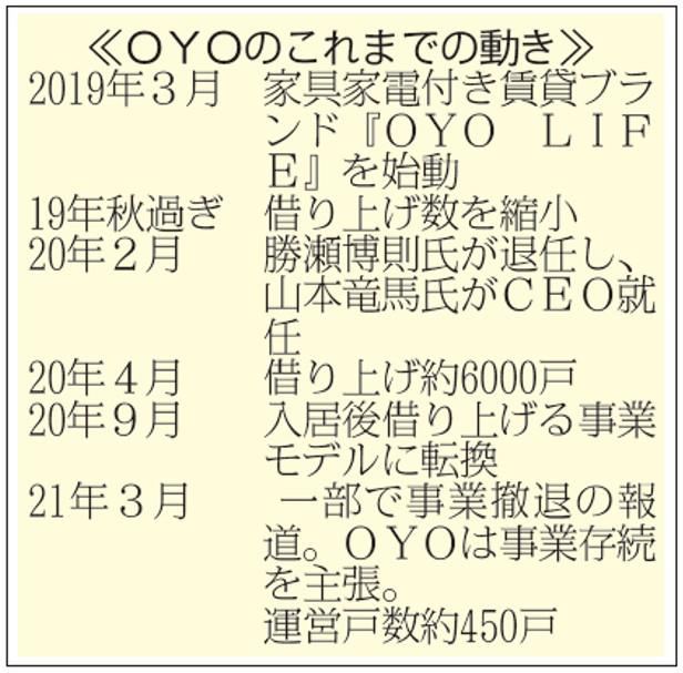 OYO、事業存続に黄信号 OYO Japan(オヨジャパン) その他|2021年04月02日 家具家電付き賃貸住宅ブランド『OYO LIFE(オヨライフ)』を展開してきたOYO Japan(オヨジャパン以下、OYO:東京都千代田区)が事業撤退するとの流説が飛び交い、関係者は不安を隠しきれない。OYOの山本竜馬CEOは「現時点で事業撤退はない」と主張。1万戸近くを借り上げるほどの拡大路線から一転、現在は500戸弱にまで運営物件を減らした同社の敗因は何だったのか。 山本CEO「現時点で撤退はしない」 「OYOが日本での事業をやめると聞いた」 OYOと提携する、ある不動産会社の社長は3月の初めに本紙の取材に対応し、こう話した。
