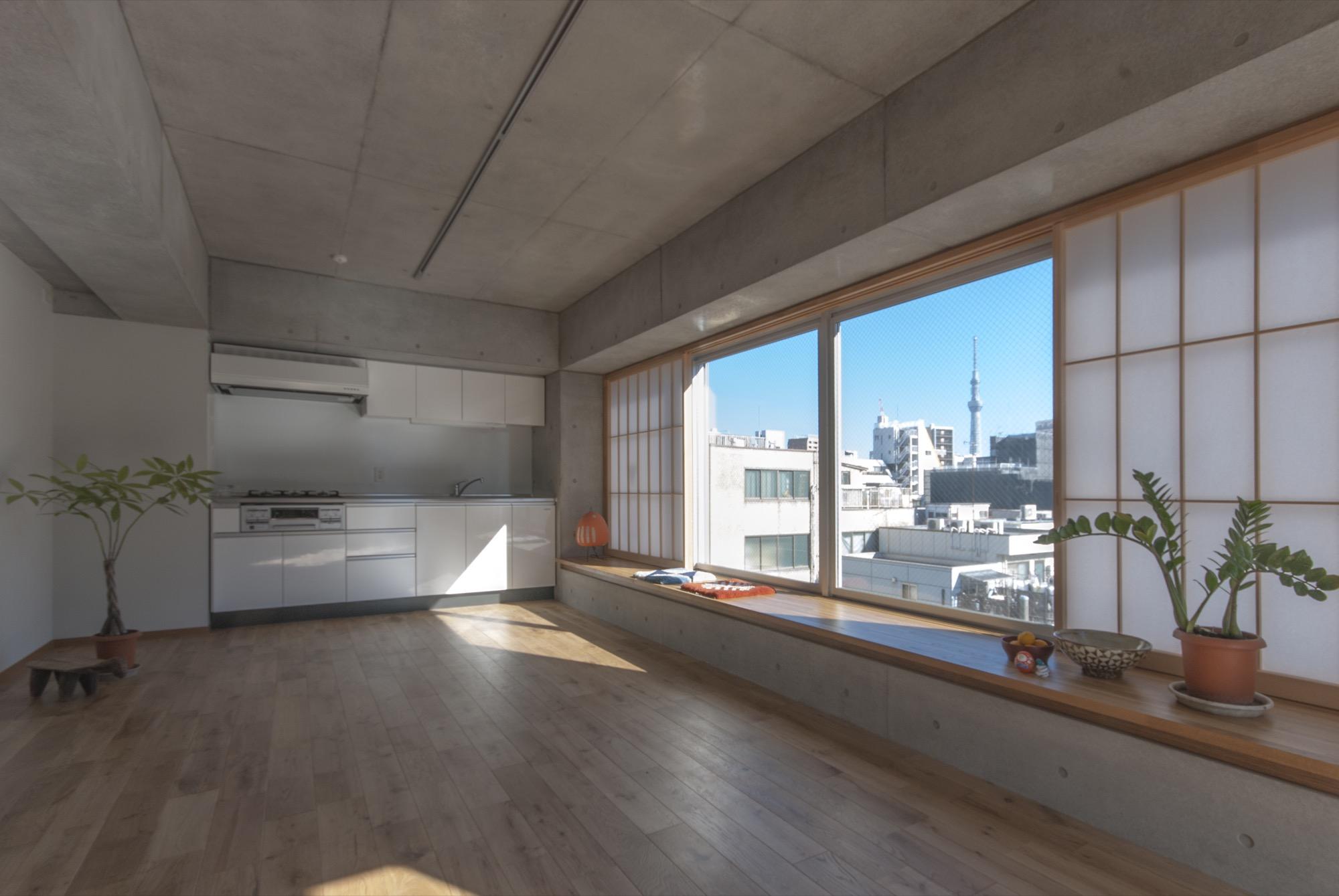 東面からはスカイツリー(一部住戸除く)や、祭りの日には神輿(みこし)の練り歩く姿が楽しめる。ちなみにこの窓には4枚の窓ガラスが使われ、幅5.1mもある。落下防止のため、障子の木目に合わせて用意されたバーを取り付けている。