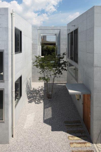 『鹿手袋の長屋』は生物建築舎(群馬県高崎市)の藤野高志代表が設計を手掛けた。日差しに考慮するため建物を三つに分け、各住戸から外の町並みが見えるように設計した。明るさを確保しながら隣地の緑を借景とし、風情が感じられるようなつくりとしたのだ。建物と建物の間の通路を、地域住民が散歩がてら通ることもあるという。