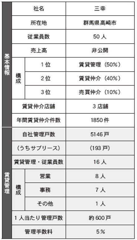 管理戸数5146戸の三幸(群馬県高崎市)では賃貸管理にかかわる各種業務を「トータルサポート」というサービス名で請け負っている。内容は、入居募集・対応、退去管理、建物維持管理(定期点検・清掃、設備点検、消防など法定点検、空室管理、駐車場・外構管理)と多岐にわたる。契約する大半の家主が同プランを選択する。管理手数料は5%。
