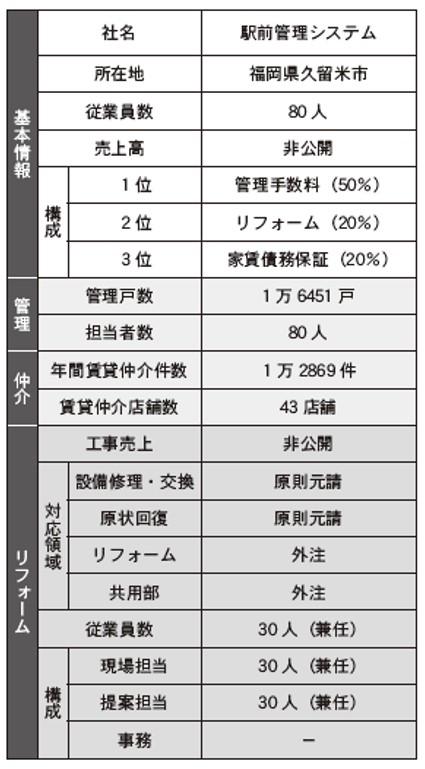 福岡県地場大手・駅前不動産(福岡県久留米市)のグループ会社で賃貸管理を手掛ける駅前管理システム(同)は、リフォーム事業が単体売上高の20%を占め、50%の賃貸管理事業に次ぐ2番手の位置づけとなる。
