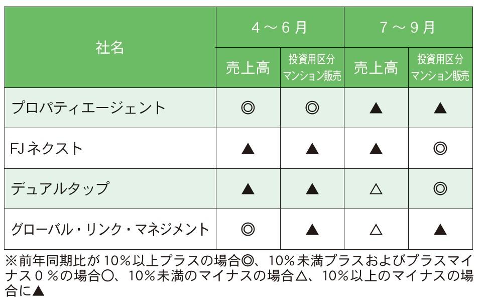 投資用区分マンション販売を主力とする上場4社の7~9月期決算が出そろった。販売実績について、プロパティエージェント(東京都新宿区)とFJ(エフジェー)ネクスト(同)は、7~9月で前年同期比プラス。デュアルタップ(東京都品川区)も国内販売は好調だった。一方、グローバル・リンク・マネジメント(同渋谷区)は区分販売の不調を一棟販売でカバーする結果となった。